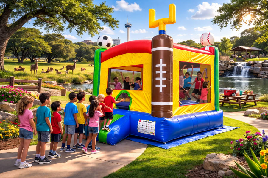 Get the game started with the Sports 13’x13’ bounce house San Antonio. This sports-themed bounce house features football, soccer, baseball, and basketball graphics. It offers a roomy 13’ x 13’ jumping area. Perfect for birthdays, team parties, school events, and backyard fun. Sky Jump Inflatables provides safe, clean, and reliable rentals across the San Antonio area. 🏀🎉