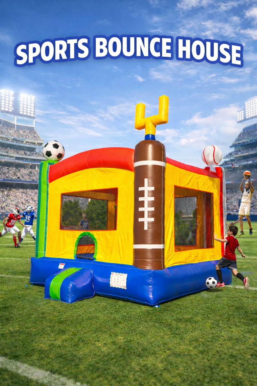 The Sports Bounce House (13’ x 13’) is perfect for a wide variety of events, especially sports-themed parties, birthday parties, school events, field days, church events, daycare activities, and community gatherings. Its colorful sports design featuring football, soccer, baseball, and basketball elements makes it a great centerpiece for any event with young sports fans.