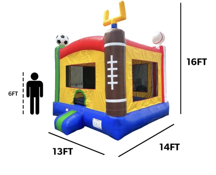 The Sports Bounce House measures 13 feet long by 13 feet wide, making it a great size for most backyards, parks, school gyms, and event spaces. The roomy jumping area allows multiple kids to bounce and play comfortably while still fitting well in standard party setups.