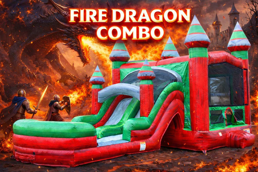 The Fire Dragon Combo Bounce House is a spacious inflatable that combines a large bouncing area with an attached slide for extra fun. Its size makes it perfect for backyard parties, park events, school functions, and community gatherings while still fitting comfortably in most event spaces.