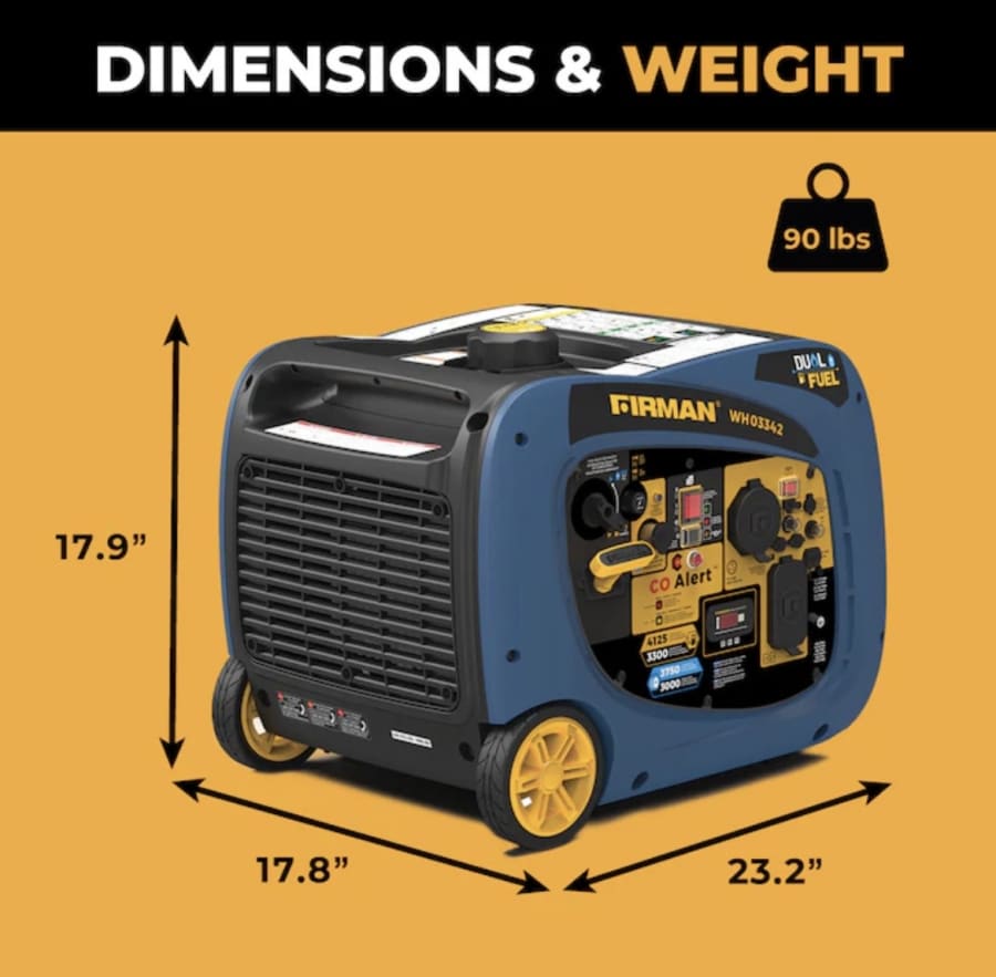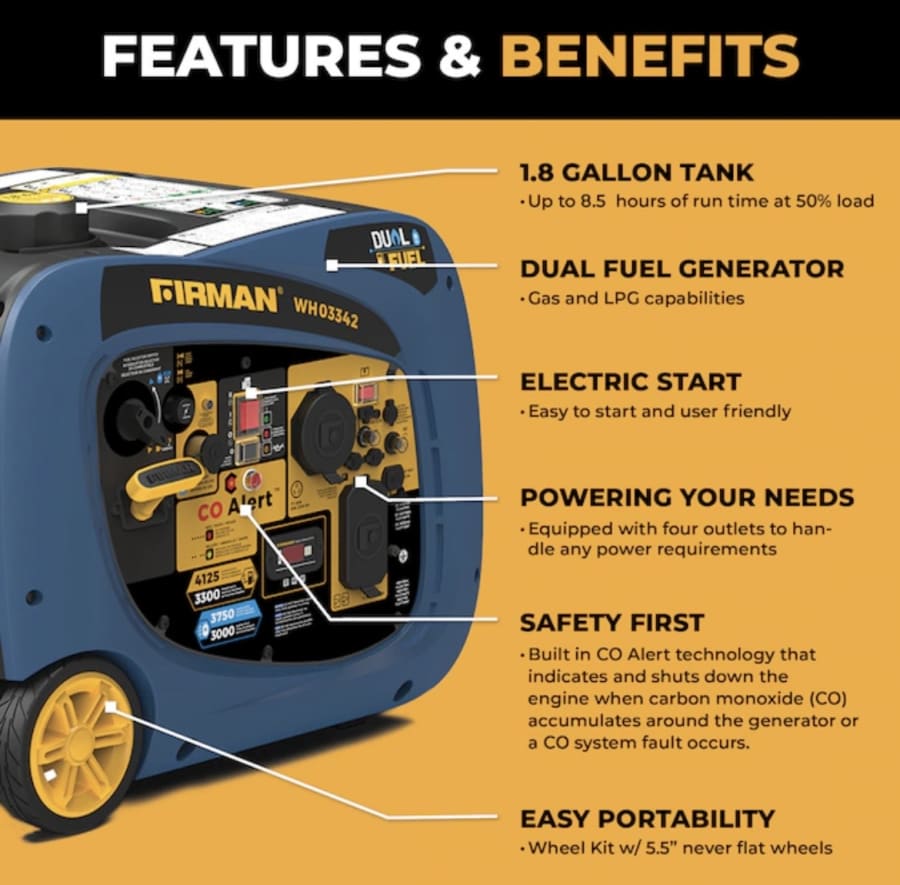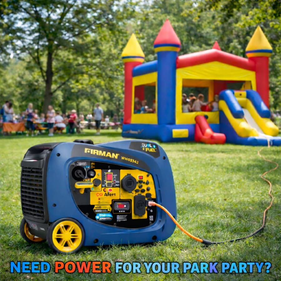 The FIRMAN WH03342 Dual Fuel Inverter Generator is a quiet, portable power solution built for park parties, outdoor events, and mobile setups. It delivers clean inverter power for speakers, lights, phone chargers, inflatables, and small appliances. Dual-fuel flexibility (gasoline or propane) extends run time and gives you on-site options. Wheels and a carry handle make transport simple. Quiet operation keeps neighborhood and park noise to a minimum.